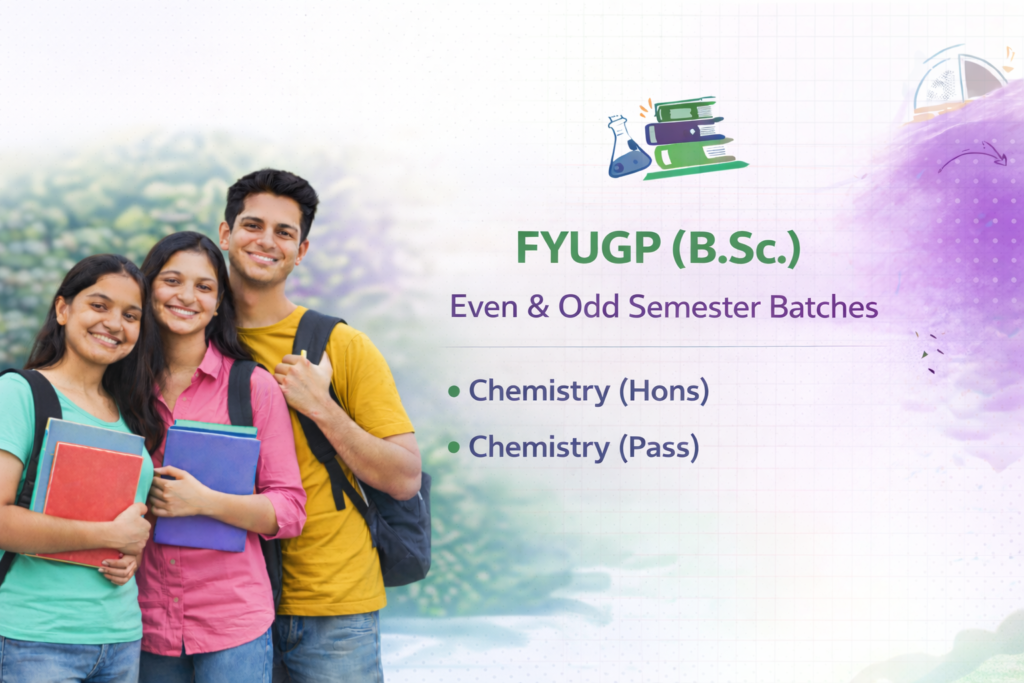 Our FYUGP B.Sc. Chemistry program is designed to build strong conceptual understanding and scientific problem-solving skills. The course covers key topics such as organic chemistry, inorganic chemistry, physical chemistry, and chemical bonding. Through structured classes and exam-focused guidance, students develop analytical ability required for academic success and competitive examinations.